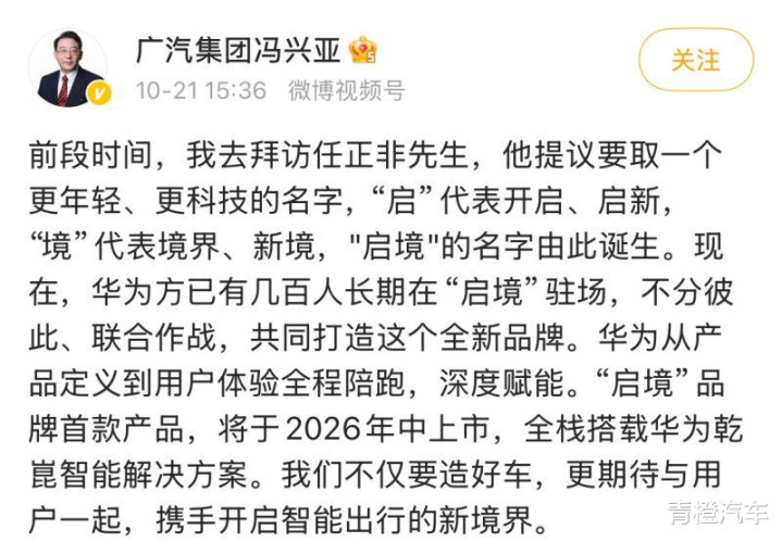 “这款车承载着‘再造一个新广汽’的使命。”这是10月21日广汽集团董事长冯兴亚与华为智能汽车解决方案BU CEO靳玉志的对话中所表达的意思,从这句话中可以看出“启境汽车”于广汽集团的战略地位。
